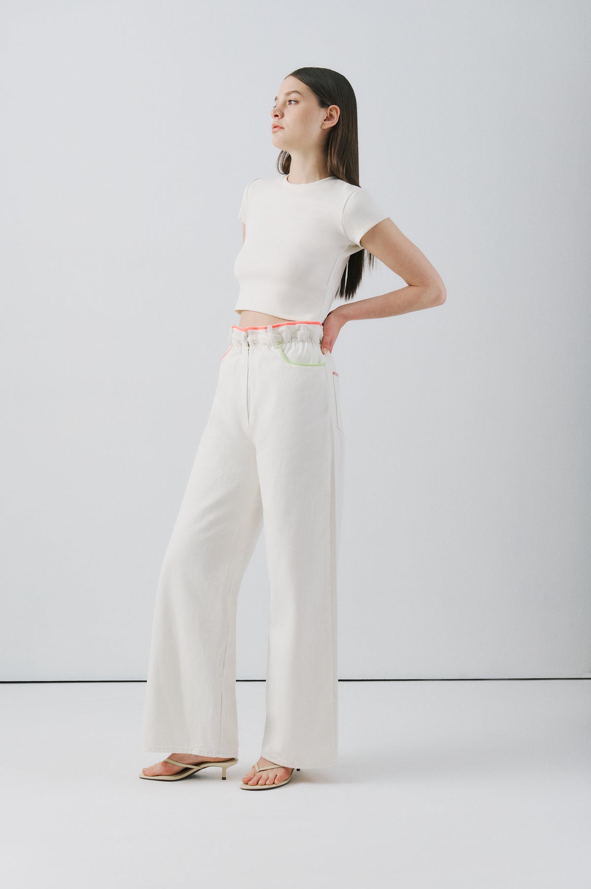 SELMACILEK Ekru Denim Neon Nakışlı Beli Lastikli Bol Pantolon Spring26 koleksiyonu için elle dikilmiştir.