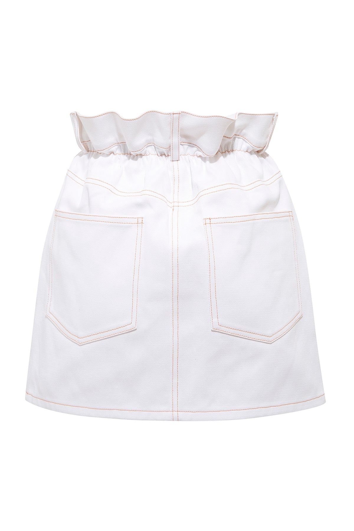 SELMACILEK Ekru Denim Beli Lastikli Kahverengi Dikişli Etek Spring26 koleksiyonu için elle dikilmiştir.
