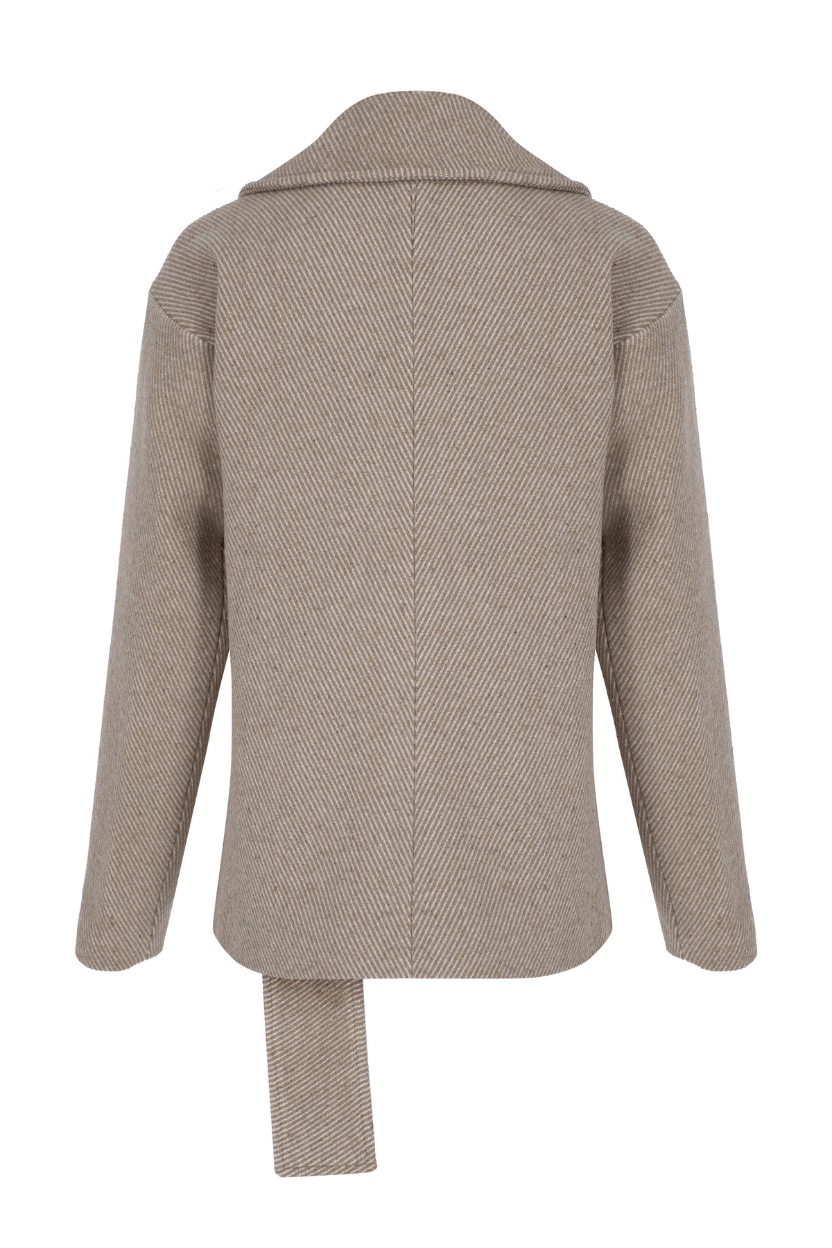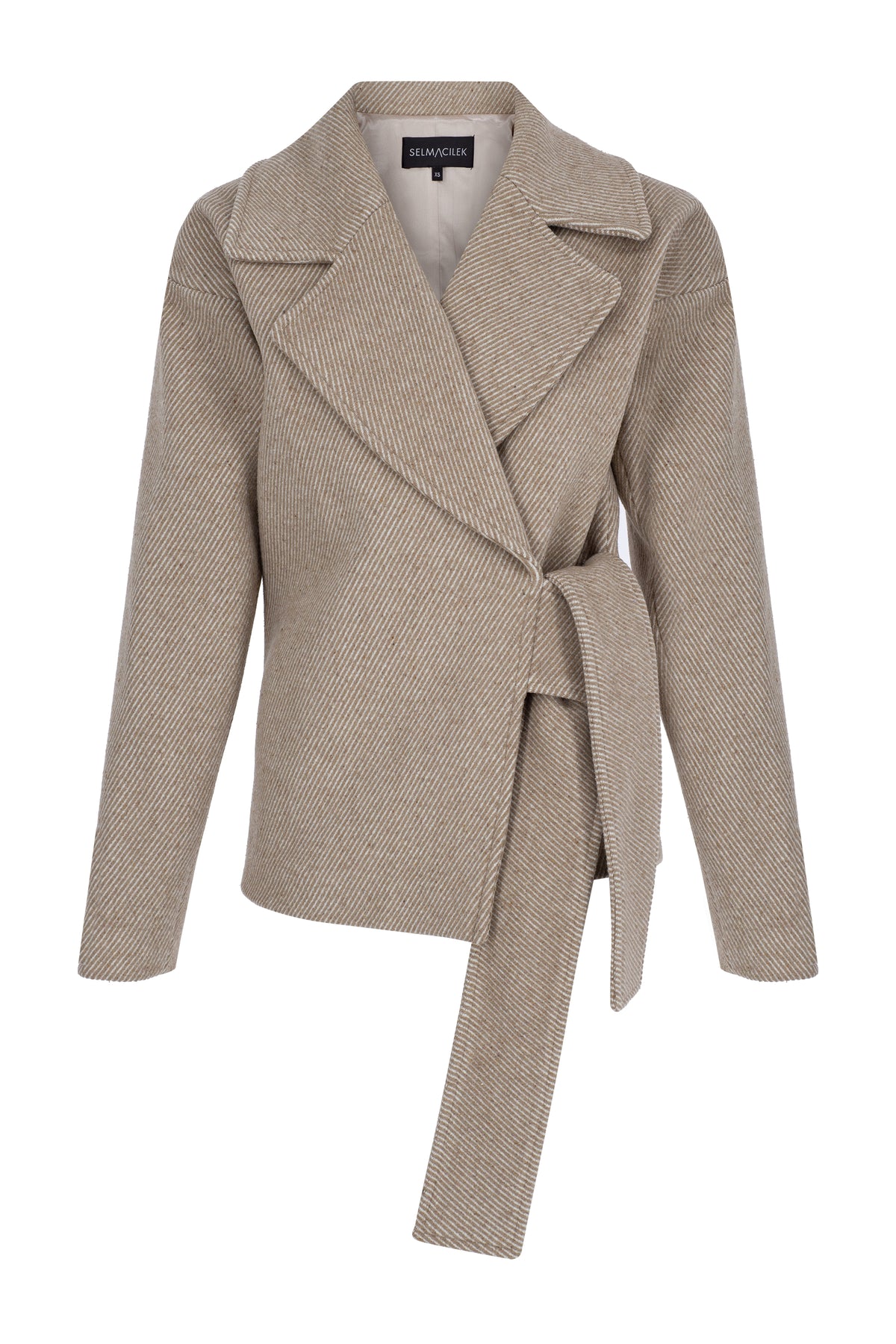 SELMACILEK Bej Çizgili Yandan Bağlama Detaylı Kaşe Kaban Sonbahar/Kış 23 koleksiyonu için elle dikilmiştir.