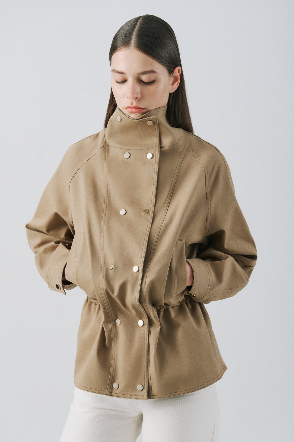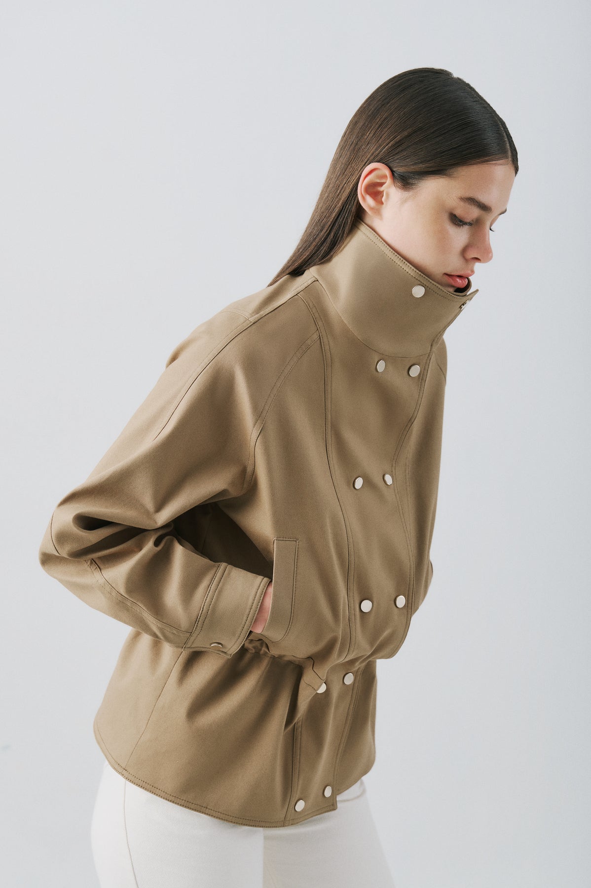 SELMACILEK Haki Kanvas Çıt Çıt Detaylı Belden Lastikli Kısa Ceket Spring26 koleksiyonu için elle dikilmiştir