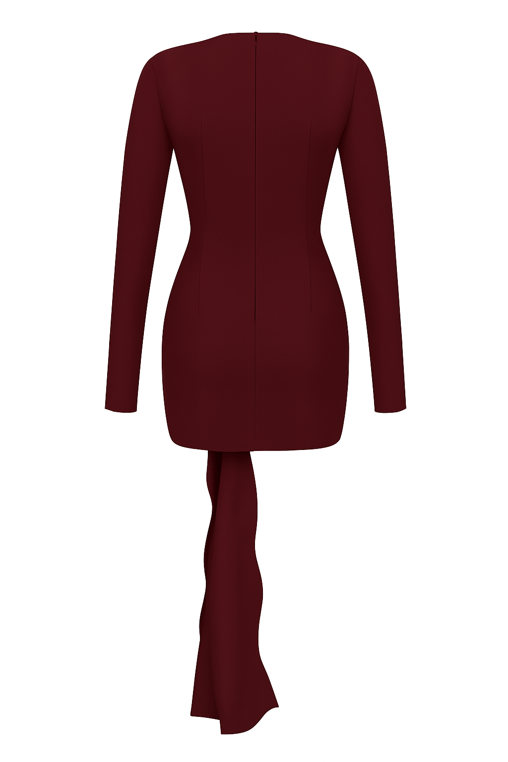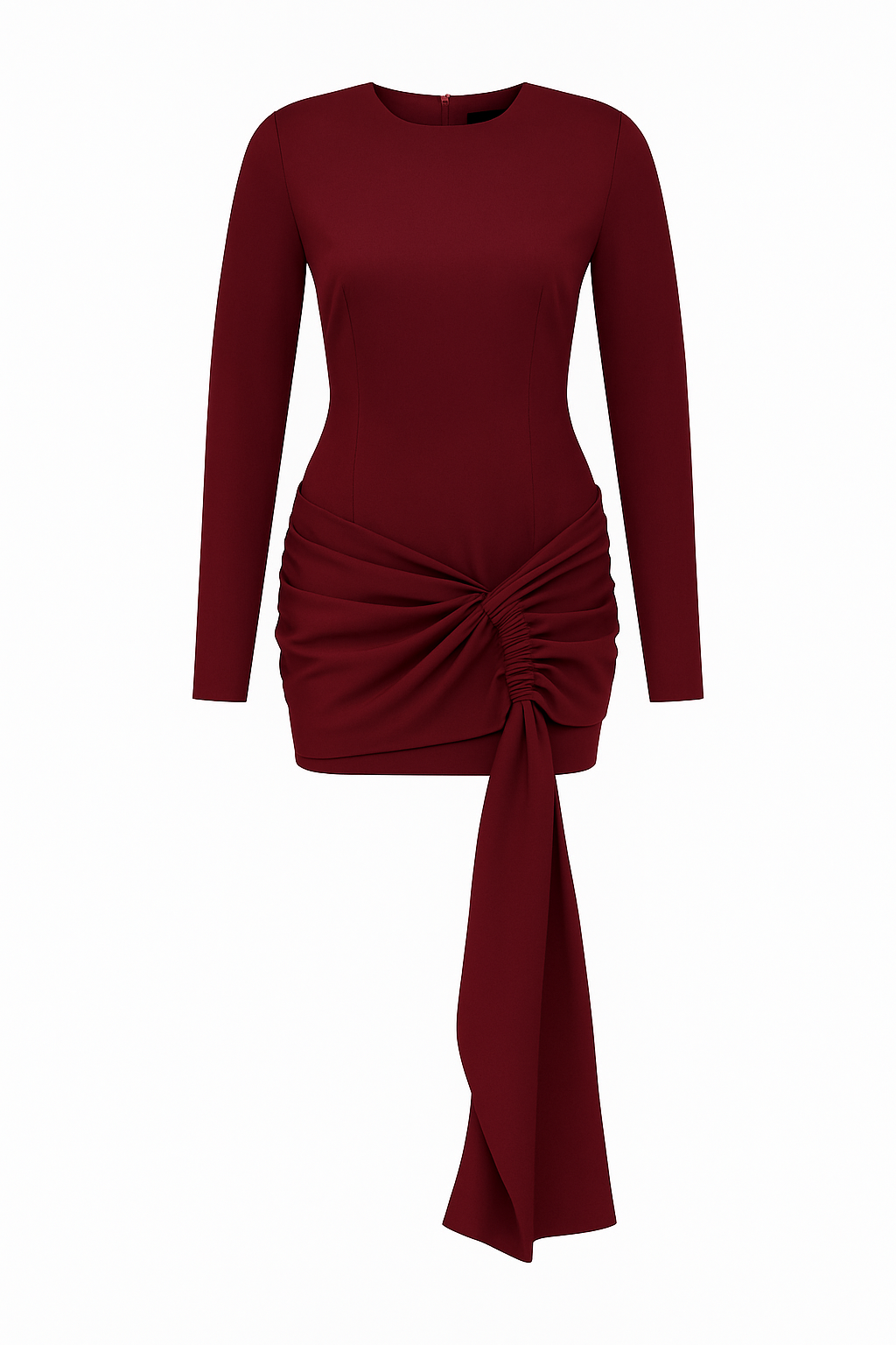 SELMACILEK BORDO BAĞLAMA DETAYLI FITTED MINI ELBİSE Sonbahar/Kış 2025 koleksiyonu için elle dikilmiştir.