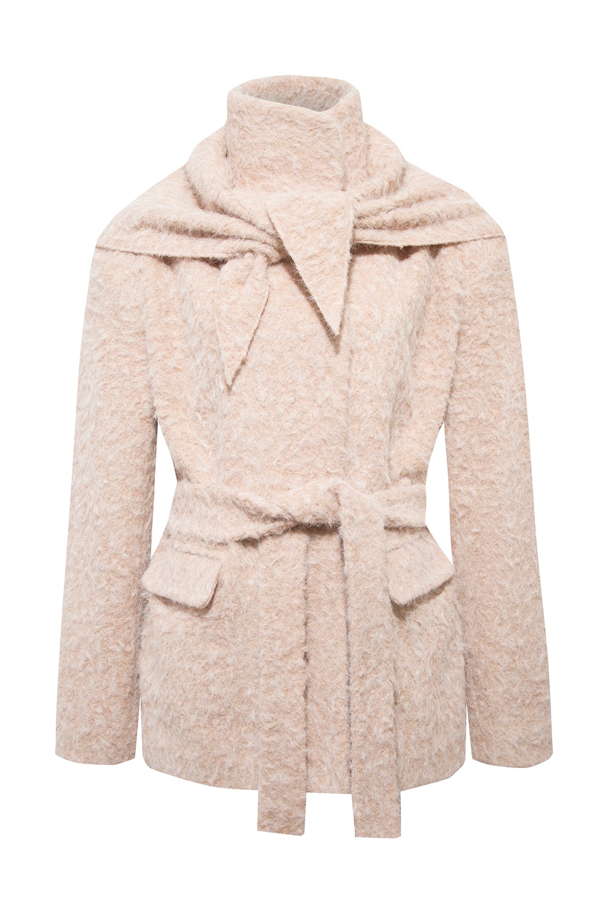 SELMACILEK Bej Kaşe Şal ve Kuşak Detaylı Kısa Kaban FW25/26 koleksiyonu için elle dikilmiştir.