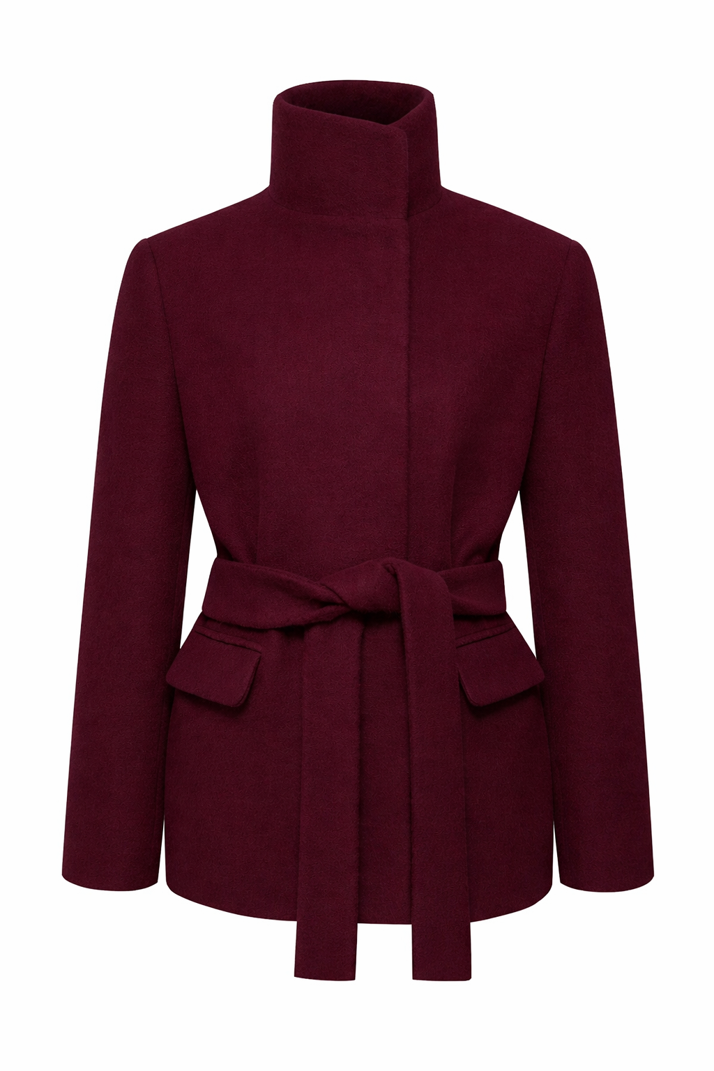 SELMACILEK Bordo Şal Detaylı Kaşe Kaban Sonbahar/Kış 25 koleksiyonu için elle dikilmiştir.