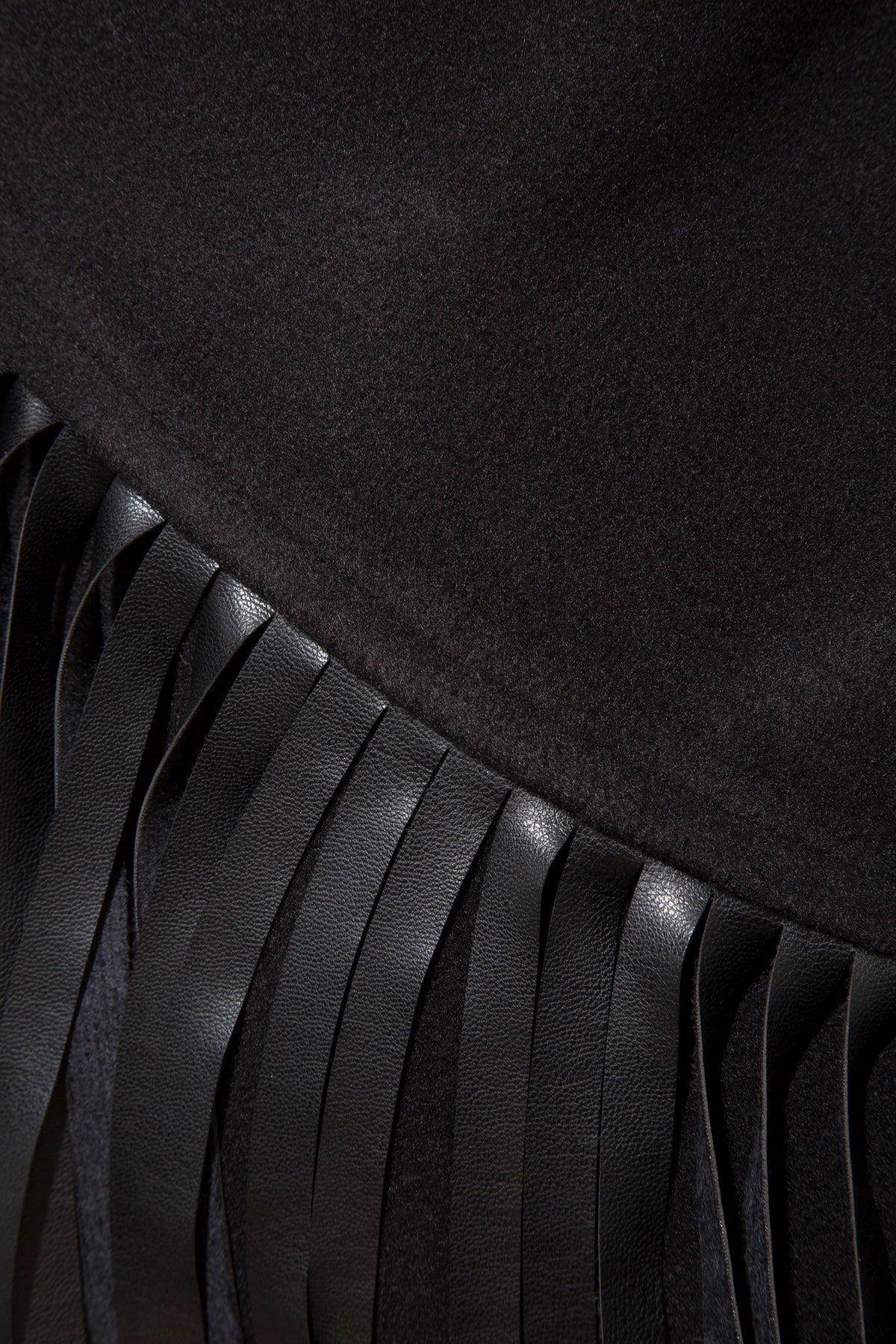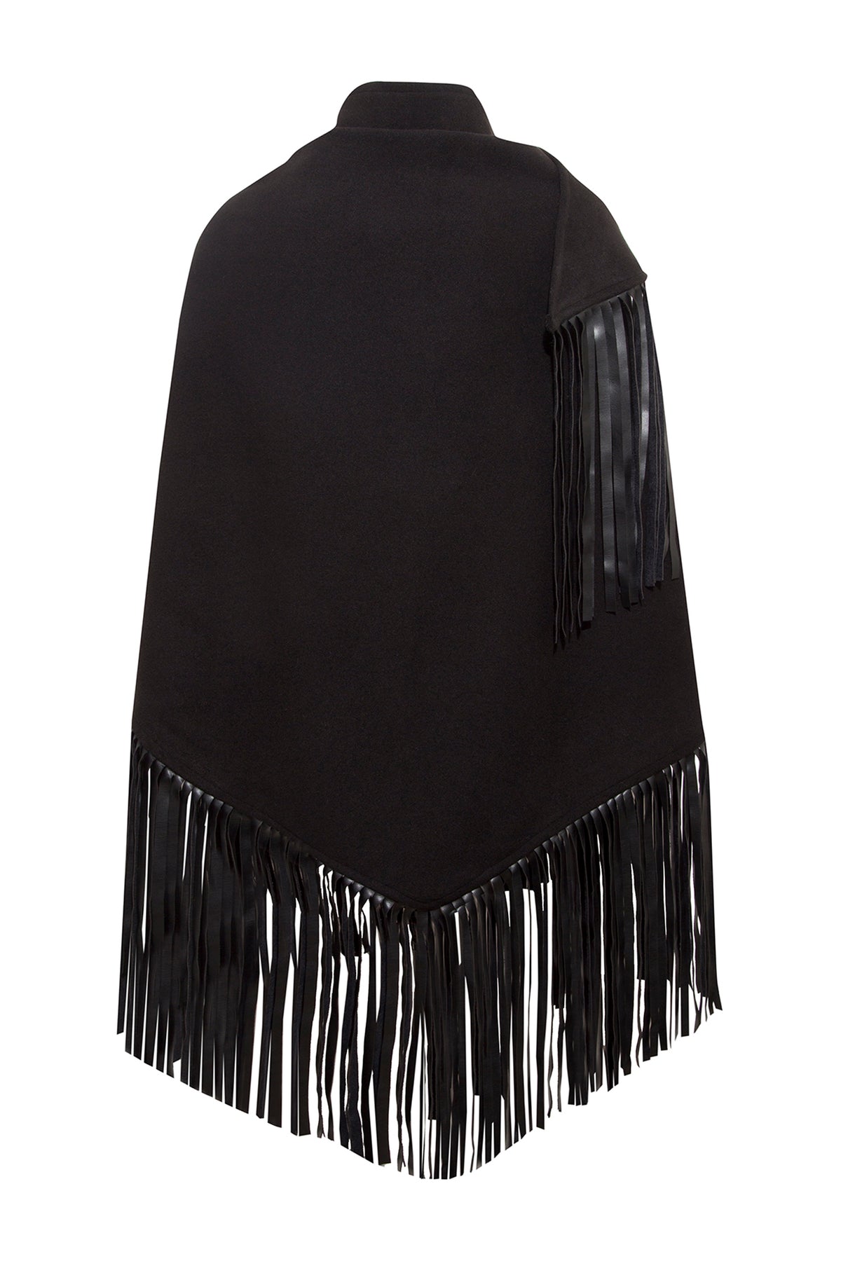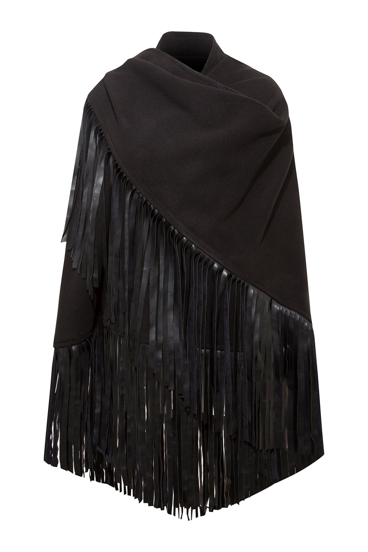 SELMACILEK Siyah Kaşe Suni Deri Detaylı Püsküllü Şal FW25/26 koleksiyonu için elle dikilmiştir.