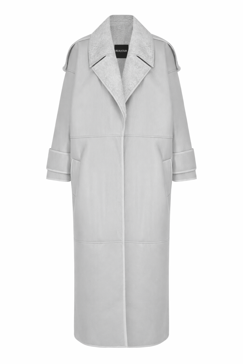 SELMACILEK Gri Suni Kürk Detaylı Vegan Deri Uzun Kaban FW25/26 koleksiyonu için elle dikilmiştir.