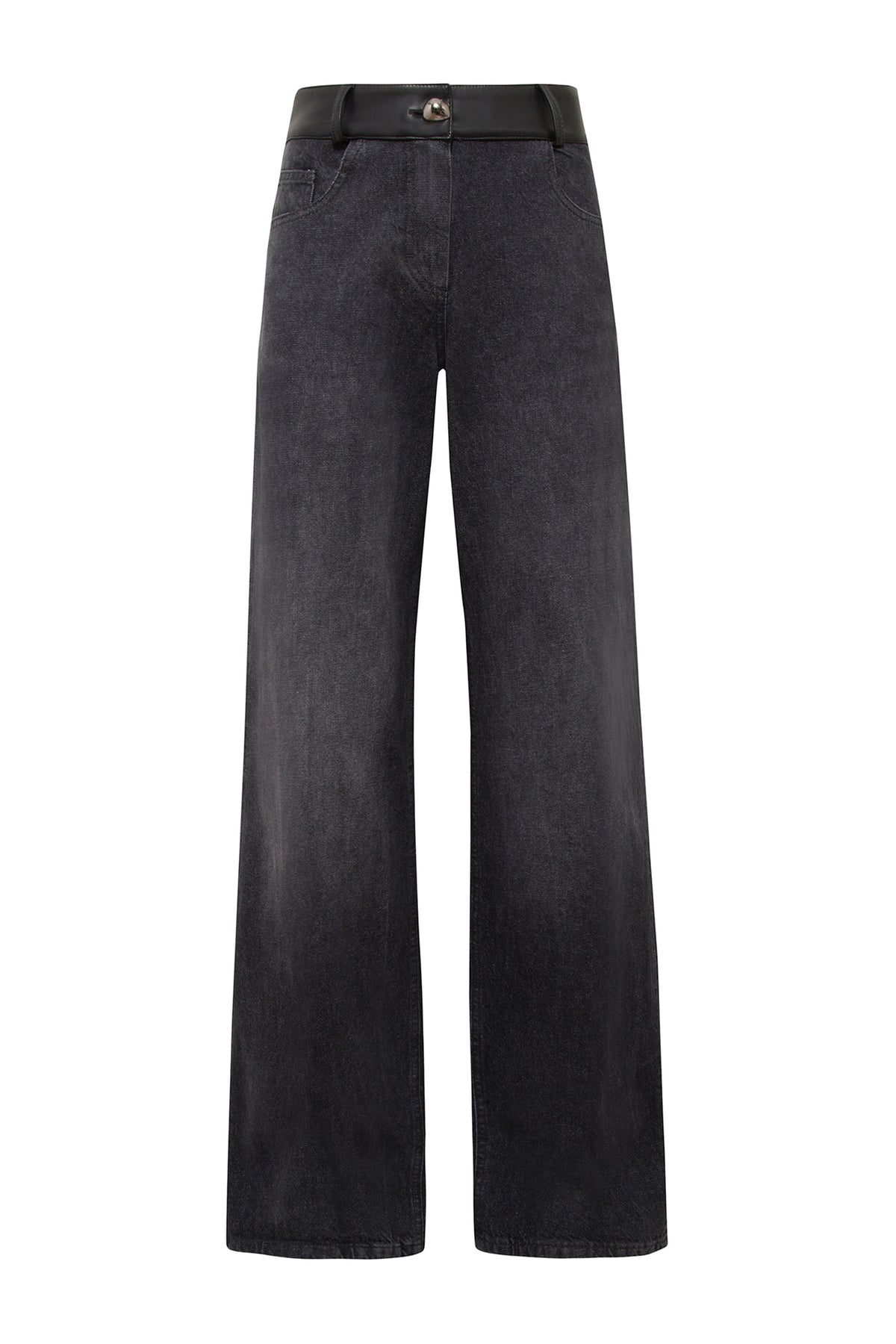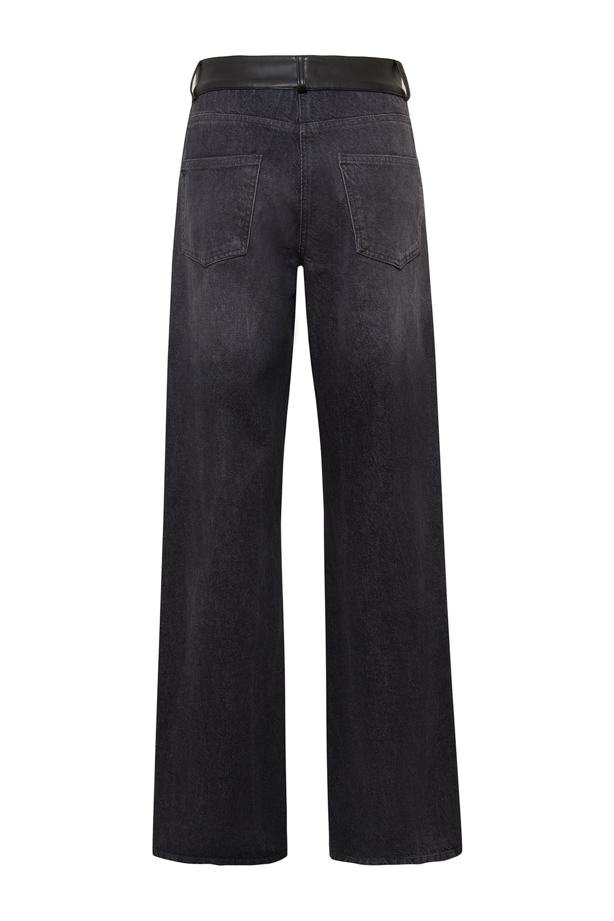 SELMACILEK Siyah Deri Bel Detaylı Antrasit Denim Pantolon FW25/26 koleksiyonu için elle dikilmiştir.
