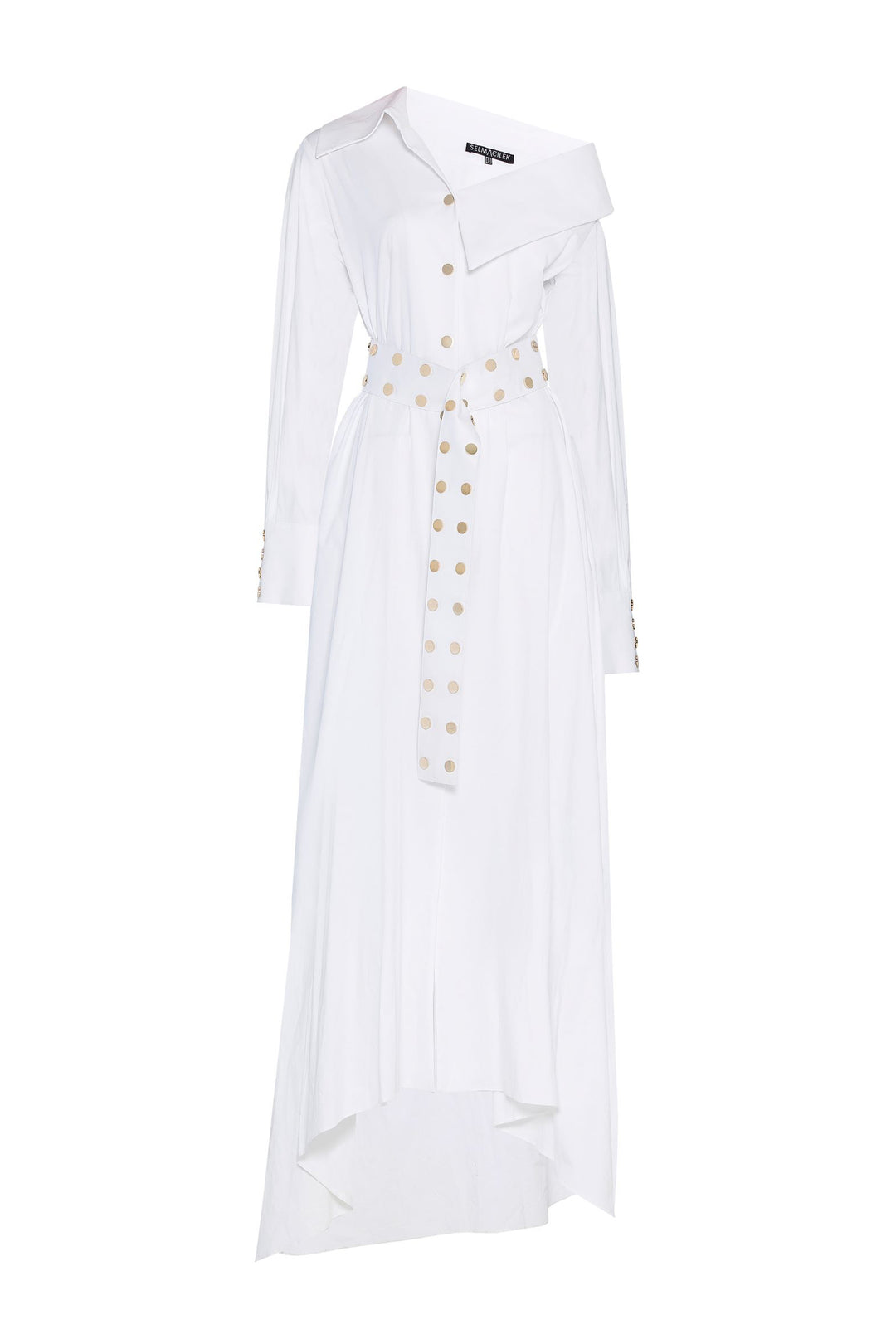 SELMACILEK Bordo Asimetrik Yaka, Uzun-Kol, Kemer Detaylı Kanvas Tulum Sonbahar/Kış 2025 koleksiyonu için elle dikilmiştir