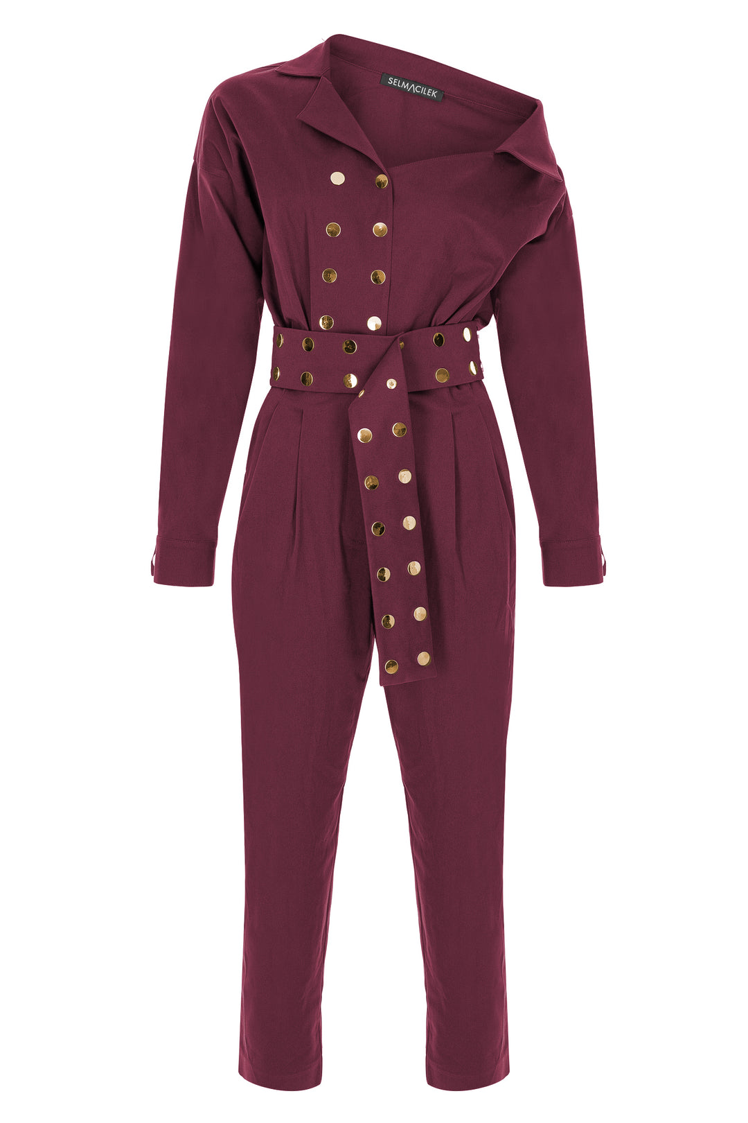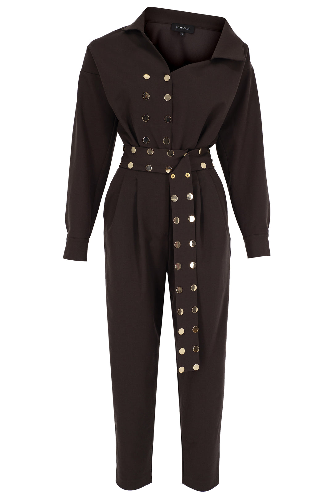 SELMACILEK Ekru Asimetrik Yaka, Uzun-Kol, Kemer Detaylı Kanvas Tulum Sonbahar/Kış 2025 koleksiyonu için elle dikilmiştir