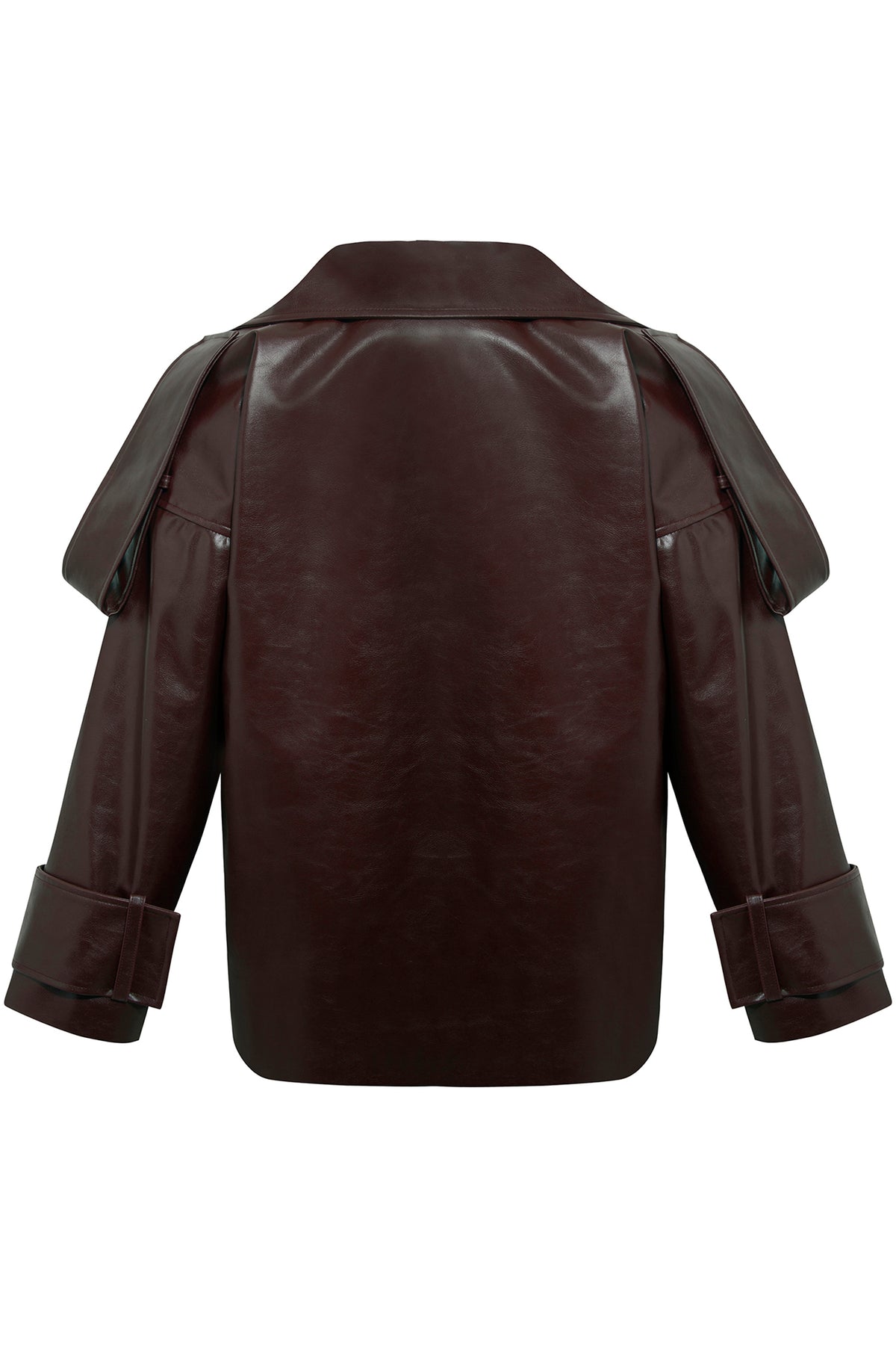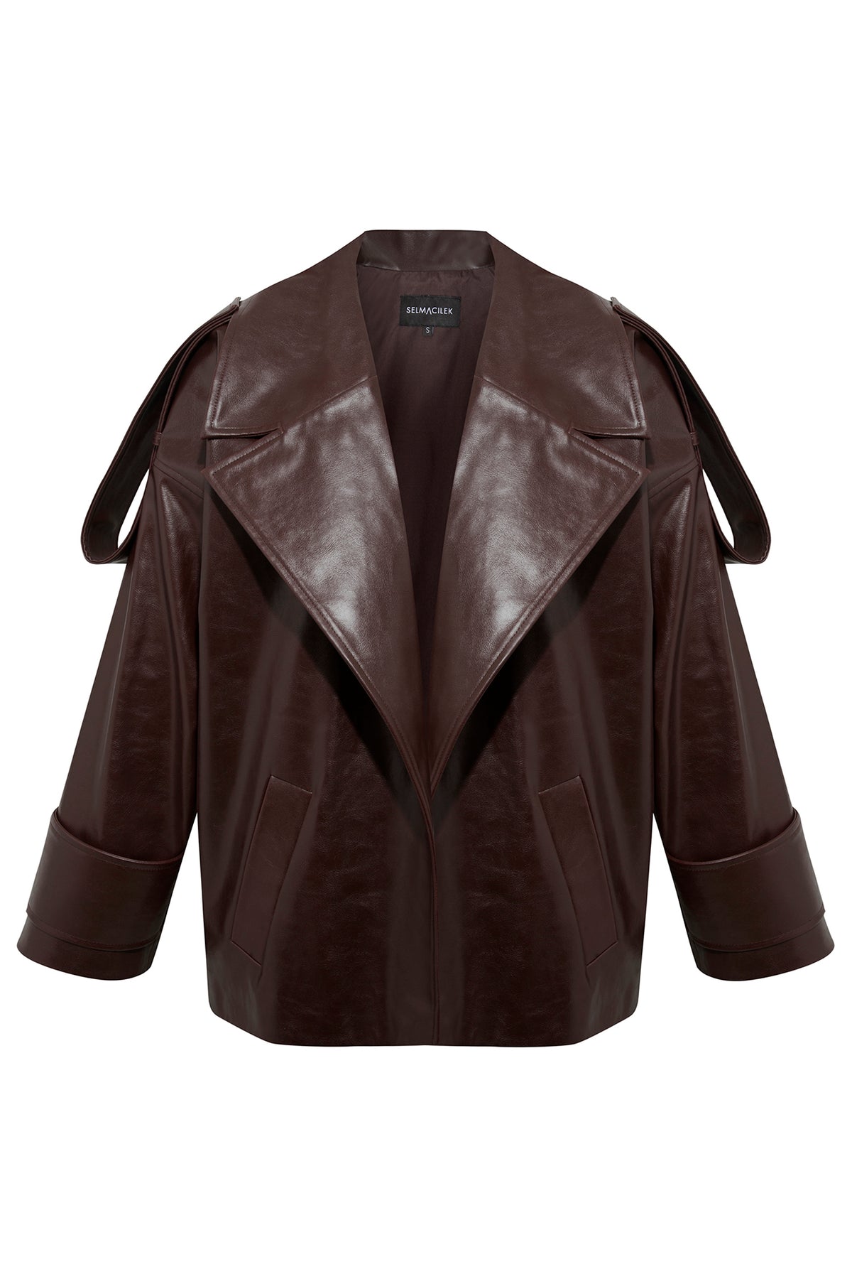 SELMACILEK KOYU KAHVE VEGAN DERİ OVERSIZED CEKET Sonbahar/Kış 2023 koleksiyonu için elle dikilmiştir.