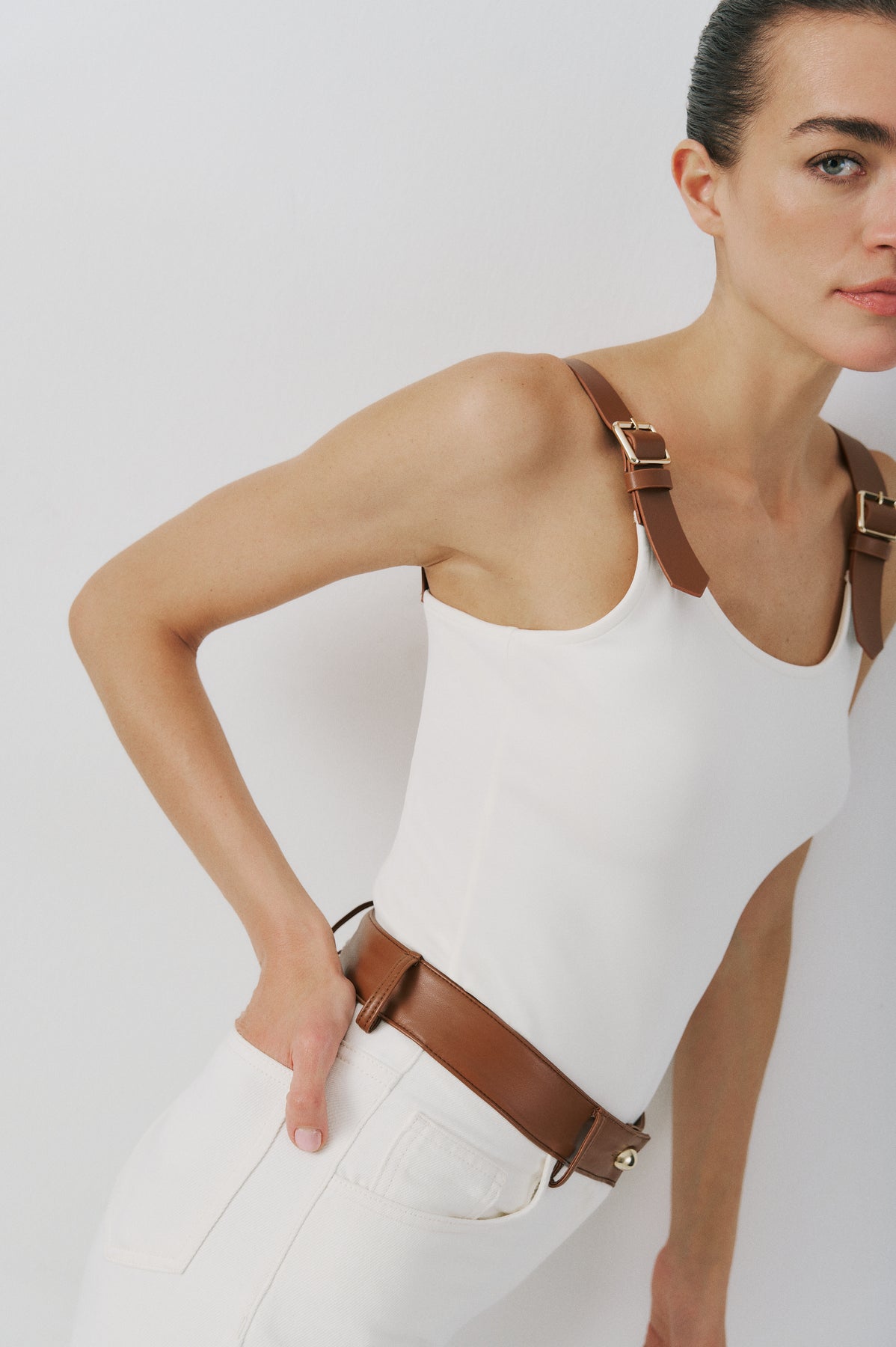 SELMACILEK Ekru Deri Bel Detaylı Denim Pantolon Spring26 koleksiyonu için elle dikilmiştir.