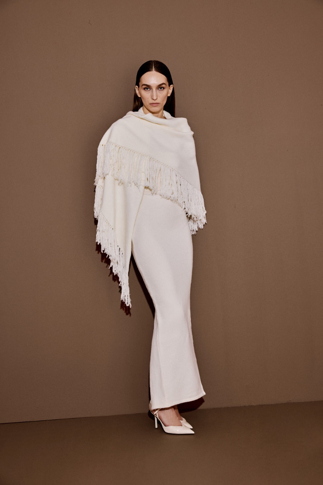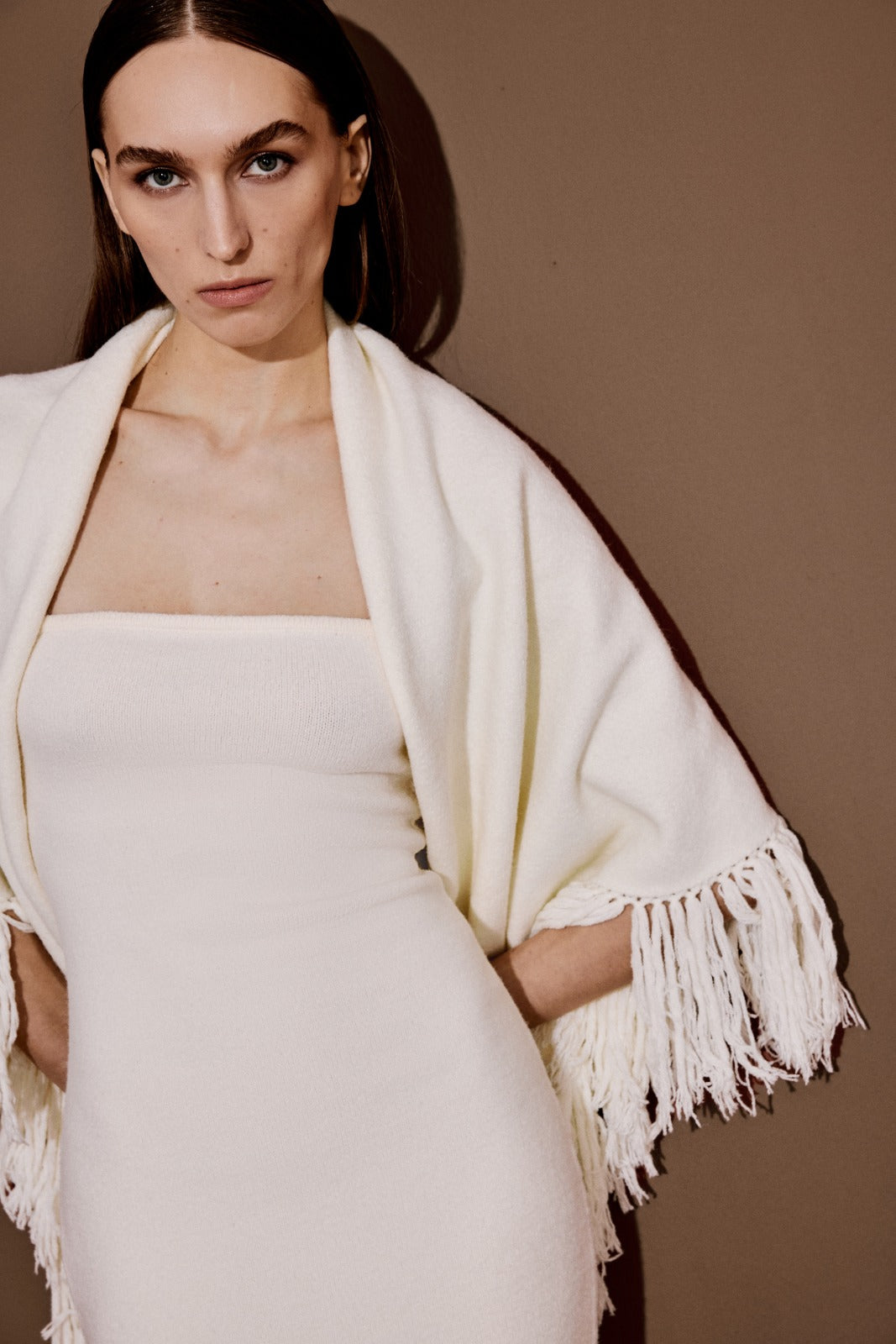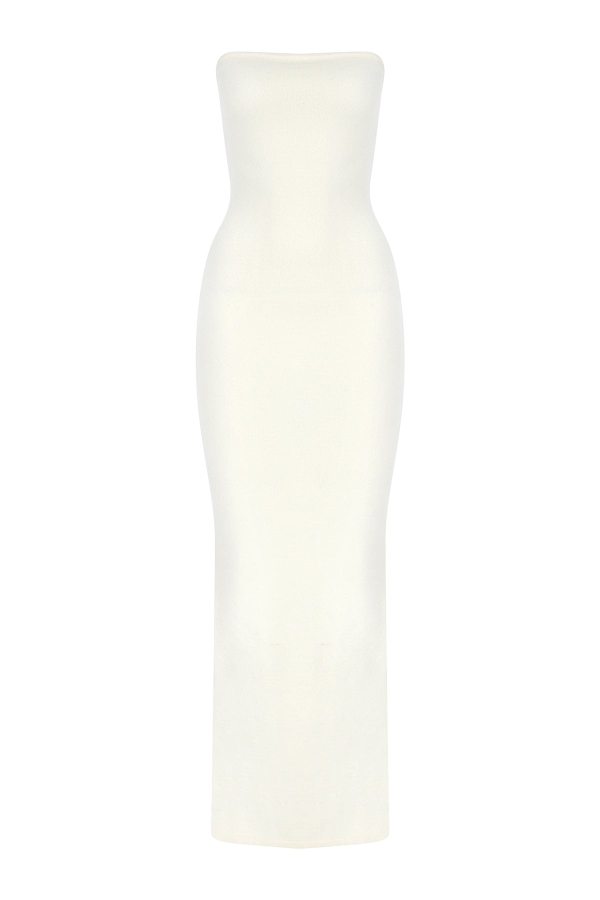 SELMACILEK Ekru Straplez Maxi Elbise FW25/26 koleksiyonu için elle dikilmiştir.