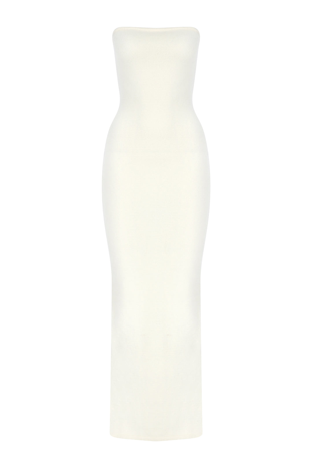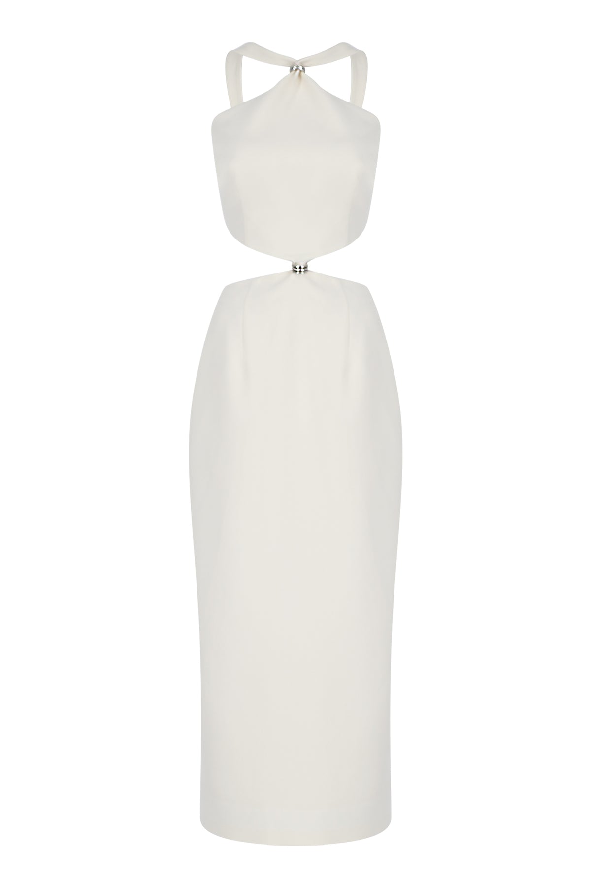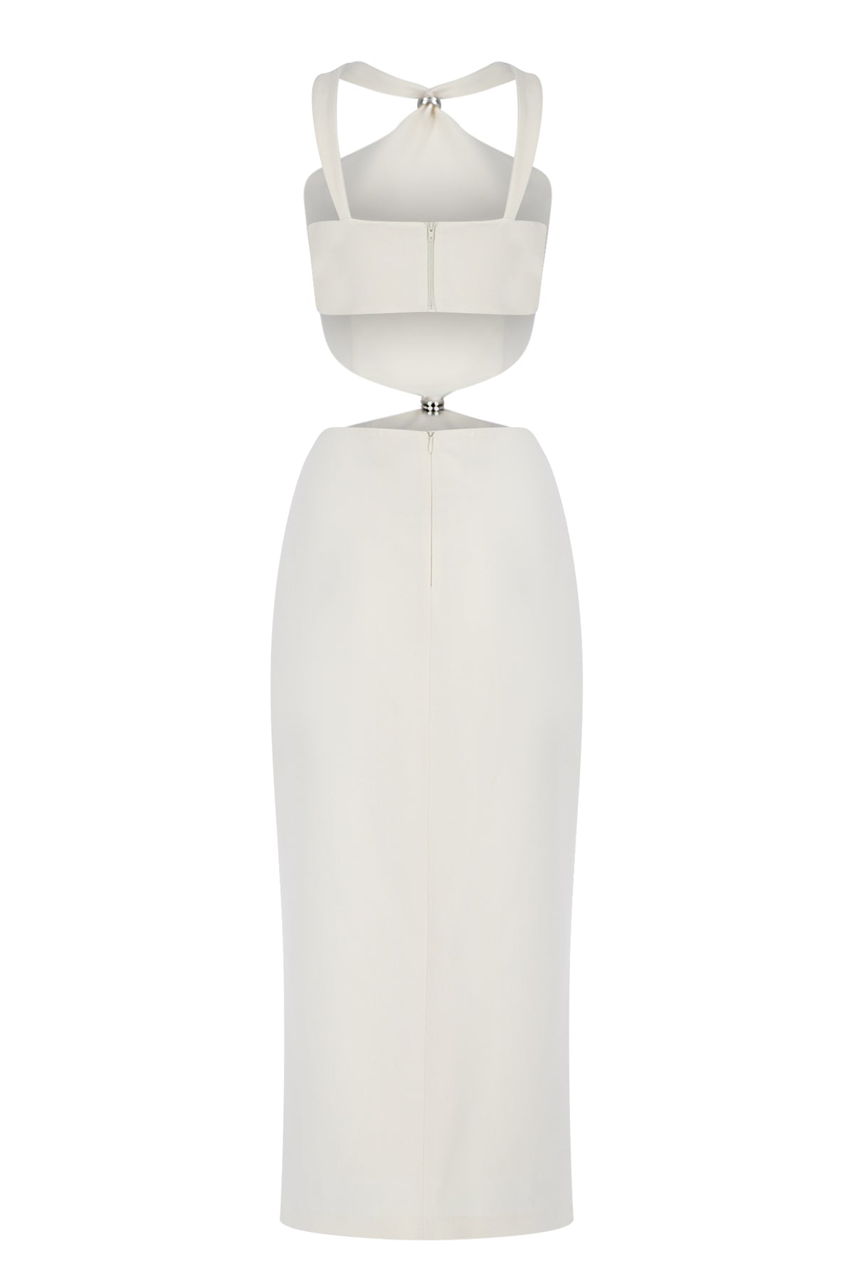 SELMACILEK Ekru Boyundan Bağlamalı Aksesuar Detaylı Maxi Elbise FW25/26 koleksiyonu için elle dikilmiştir.