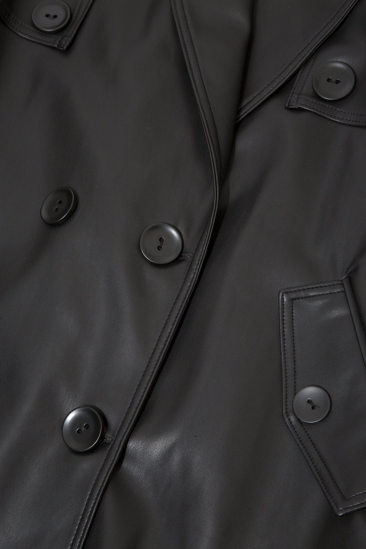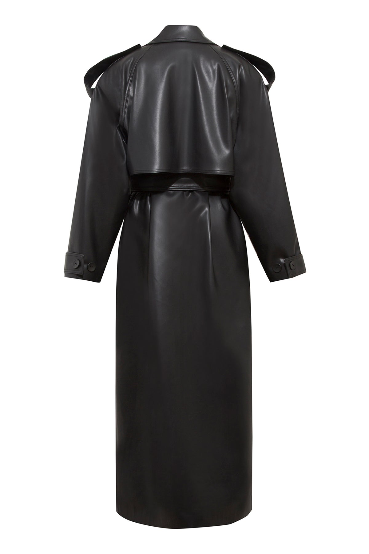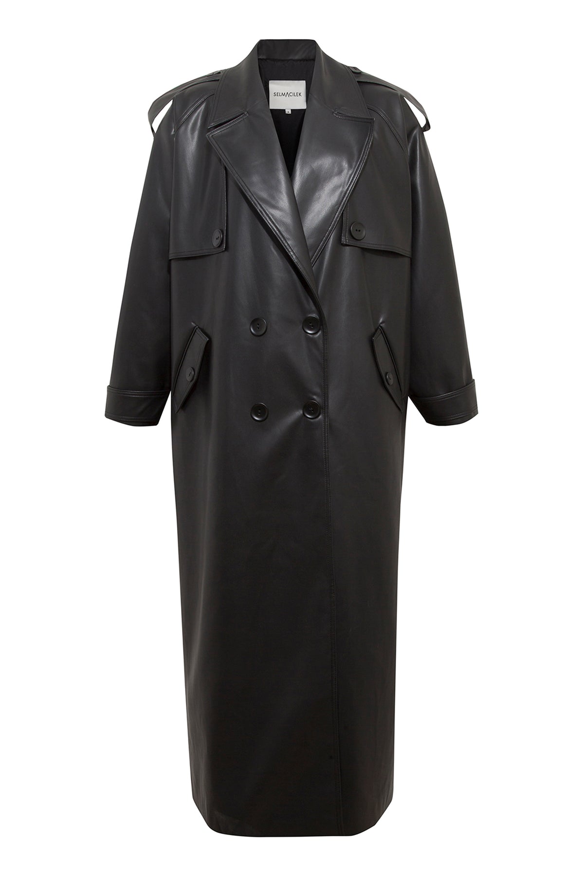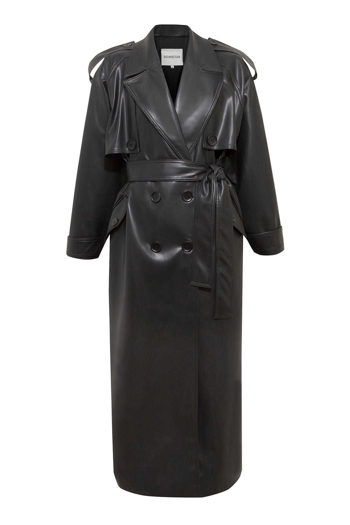 SELMACILEK Siyah Vegan Deri Uzun Trençkot FW25/26 koleksiyonu için elle dikilmiştir